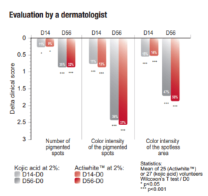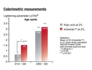 Randomized trial on 25 Asian female volunteers between 18 to 70 years old of having a phototype III and IV, all skin types. The specific requirement was the presence of well-defined pigmented spots on each side of the face associated to a spotless area. Twice a day application for 8 weeks of an emulsion containing 2% Actiwhite™ or 2% kojic acid. Evaluation by colorimetric measurement, dermatologist, self-assessment and macrophotograph of visibility, size and number of the age spot, skin complexion