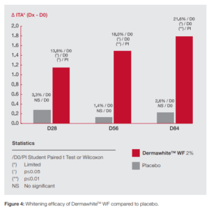 The whitening index ΔITA is improved by 21.6% after 3 months of treatment with Dermawhite™ WF while the improvement with the placebo only reaches 2.6%