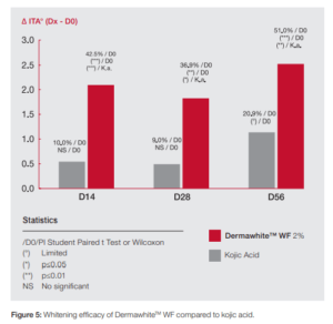 Dermawhite™ WF shows a fast action: a significant improvement of 42,5% is already observed after only 2 weeks of treatment. The whitening index ΔITA is improved by 51.0% after 2 months of treatment with Dermawhite™ while the improvement with kojic acid only reaches 20.9%. Increase in luminosity is also measured and higher than with kojic acid.